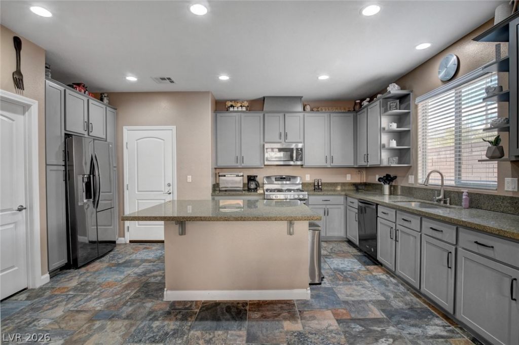 This stunning almost 3,000 sq ft residence perfectly balances expansive, open-concept grandeur with thoughtfully placed private retreats. Featuring 5 bedrooms and 3 full baths, the versatile floor plan includes a main-floor suite, ideal for multi-generational living or a secluded guest wing alongside an enclosed den perfect for a home office. The heart of the home is a chef-inspired kitchen boasting granite countertops, island, and a walk-in pantry, flowing effortlessly into the dining and family areas. Upstairs, the primary sanctuary is separate from 3 additional bedrooms and a sprawling loft, offering space for gaming or lounging. Practicality meets style throughout, from the rare 3-car garage with ample storage to the low-maintenance desert oasis outside, complete with synthetic turf and a dedicated dog run. Nestled near the base of the Las Vegas mountains, you are just minutes from scenic hiking trails, premier shopping and easy Beltway access.