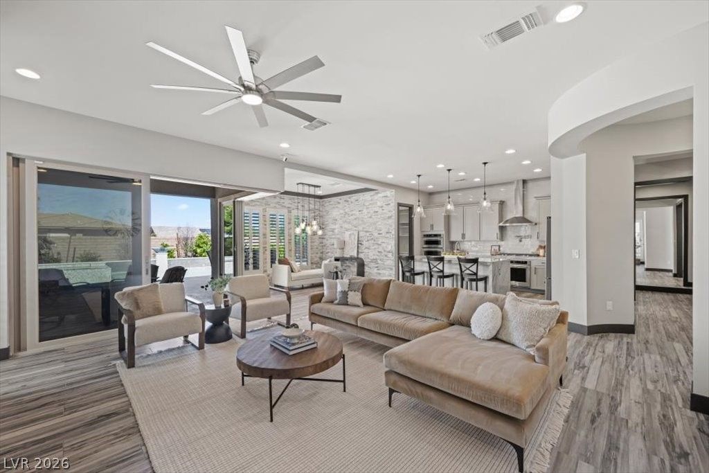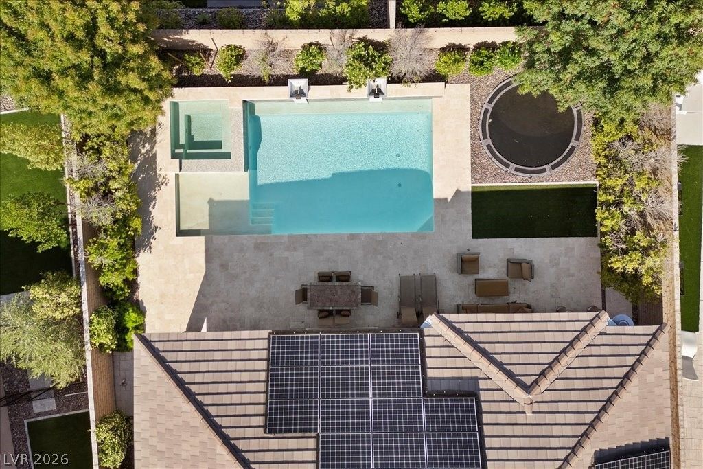 OPEN HOUSE 5/2?5/3 | 12?3 PM Experience luxury in the guard-gated, resort-style community of Reverence in Summerlin. This upgraded single-story home offers 5 bedrooms, 4.5 baths, and over 3,100 sq ft of open-concept living. Highlights include a private casita, 3-car garage, owned solar with Tesla Powerwall, and a backyard retreat featuring a pool, spa, covered patio, in-ground trampoline, and mountain views. Expansive sliders create seamless indoor-outdoor living. The chef's kitchen boasts a waterfall island, double ovens, and walk-in pantry. The spacious primary suite features a built in entertainment cabinet, expansive space and is complemented by four additional bedrooms, ideal for guests, office, or multigenerational living. Residents enjoy a clubhouse, fitness center, pools, pickleball, trails and Strip views?minutes from top schools, parks, and premier Summerlin dining and shopping.
