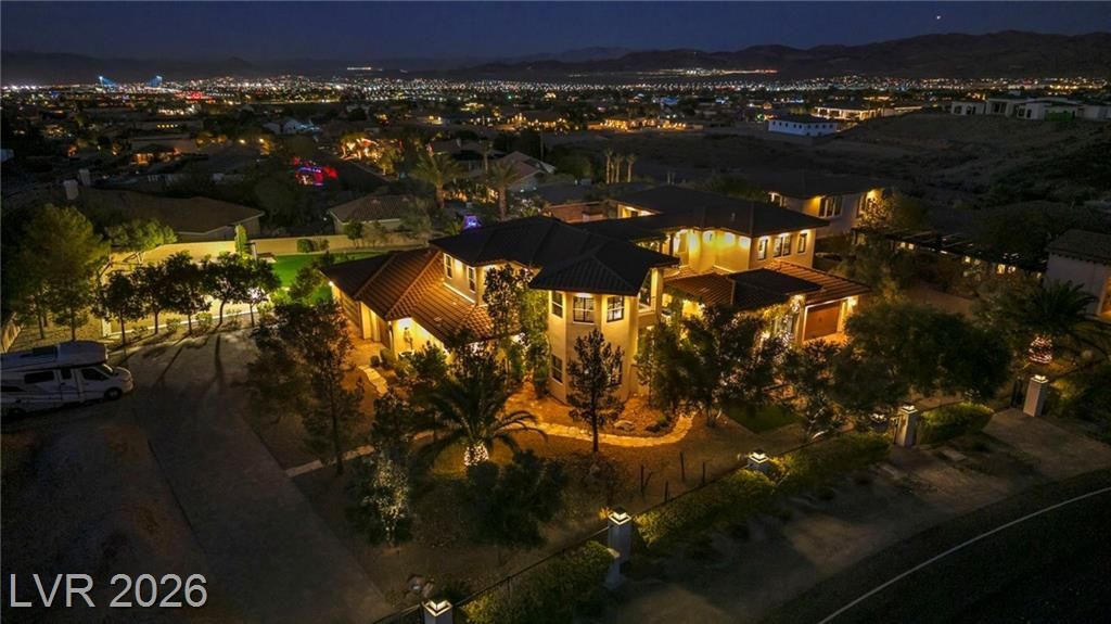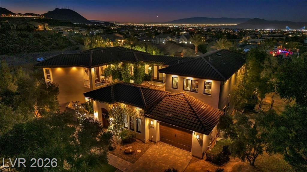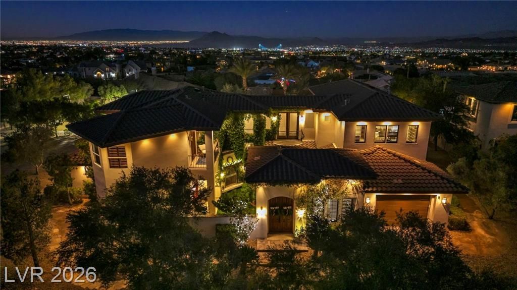 Set beyond a private gated entry on a secluded one-acre parcel high in the Canyon Hills of Henderson, this elevated California-style estate commands sweeping, unobstructed views of Mission Hills, the Las Vegas Valley, and the surrounding mountain ranges. The curated interior features five spacious bedrooms and seven luxurious bathrooms. A wine room with a hand-carved teak door creates a striking focal point, while the gourmet kitchen showcases professional-grade appliances, a custom copper hood, farmhouse sink, and chiseled-granite oversized island. The primary suite is a spa-inspired bath and dual rain showers. Upstairs, teak flooring leads to an entertainment lounge with wet bar and deck access showcasing breathtaking views. Resort-style grounds include mature landscaping, a romantic courtyard with fireplace, casita, five-car garage, sports court, fireplace, and custom BBQ pavilion. A rare, one-of-a-kind property offering an unparalleled level of privacy and exclusivity.