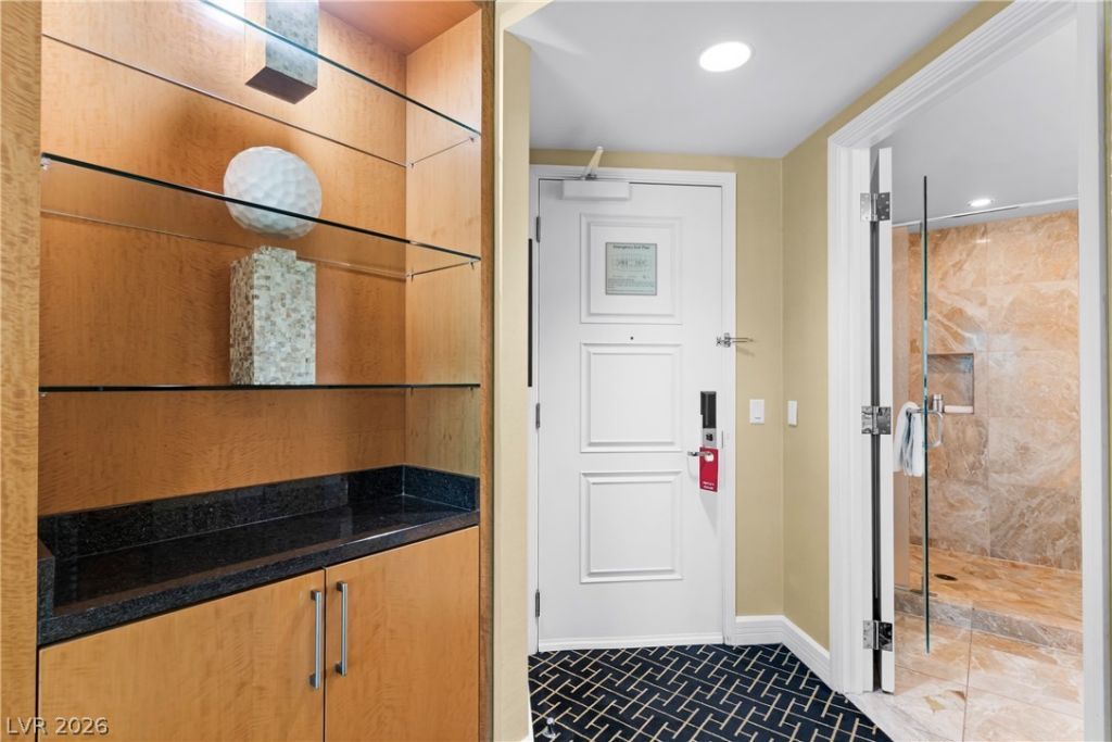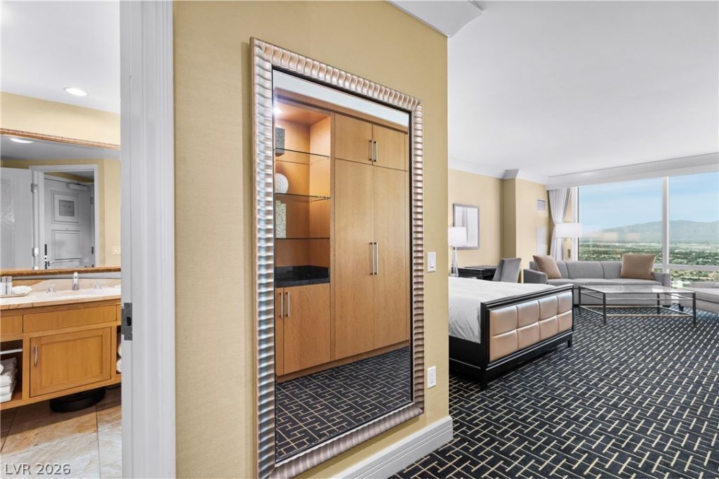 Perched on the 56th floor of Trump International Hotel Las Vegas, this luxurious high rise condo offers a sophisticated retreat just steps from the Strip. Floor to ceiling windows frame sweeping views of the North Strip and dazzling city lights, creating a stunning backdrop day and night. The open studio layout lives large with a well appointed sleeping and sitting area, elegant finishes, and a spa-inspired bath. A sleek kitchenette that has Subzero, Bosch, and Wolfe appliances, granite counters, and built in cabinets for quick meals between adventures in the city. Owners enjoy world class hotel style amenities, including resort pool with cabanas, spa, fitness center, concierge, in room dining, free valet, car service & 24 hour security in a smoke free, non gaming building. All of this is located directly across from Fashion Show Mall, near Wynn and Resorts World, with premier shopping, dining, and entertainment at your doorstep. This property has been refreshed and is ready to go!