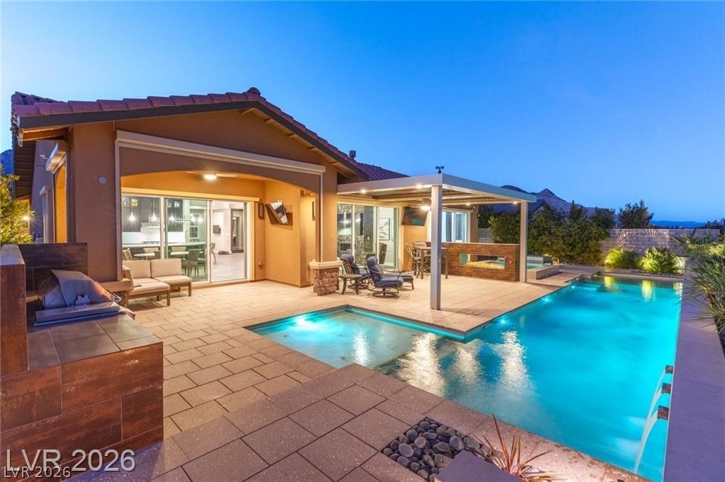A rare opportunity awaits the savvy buyer!Experience refined luxury in this single-story Toll Brothers home with three bedrooms plus office/den in the prestigious Montecito community.Perched on an elevated end-of-cul-de-sac lot, the home captures panoramic Strip and mountain views.A private courtyard with fireplace welcomes you to a striking pivot front door and open, light-filled floor plan.The chef's kitchen with JennAir appliances flows into expansive living areas, enhanced by sliding glass doors across the rear for seamless indoor-outdoor living.The home offers flexible living options, including a bedroom with adjacent living space and private entrance, ideal for multigenerational living.The primary suite features a spa-like bath with steam shower, custom closet, and private jacuzzi with a dramatic two-sided fireplace.The backyard is a true retreat, showcasing a sleek pool, two tanning decks, spa, and outdoor kitchen.Priced to sell and ready for its next chapter?don't miss this one