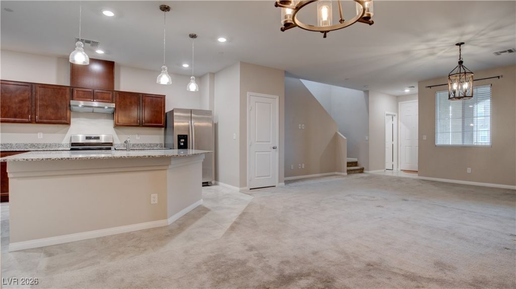 Inspirada townhome ? 3 bedrooms ? epoxy garage floor ? near parks, pools, and trails. Move-in ready two-story townhome featuring an open floor plan with a granite kitchen, stainless steel appliances, and seamless flow between the kitchen, dining, and living areas. Additional features include window coverings throughout, raised bathroom vanities, and a primary bedroom separated from secondary bedrooms. Exterior highlights include a covered front porch, paver driveway and walkways, and epoxy-coated garage flooring. Located in the Inspirada community with access to multiple parks, pools, playgrounds, and walking trails. Conveniently positioned near shopping centers, dining options, fitness facilities, and freeway access with connections to the airport corridor and Las Vegas Strip. Nearby outdoor recreation areas and community amenities provide additional options for activities and open space.
