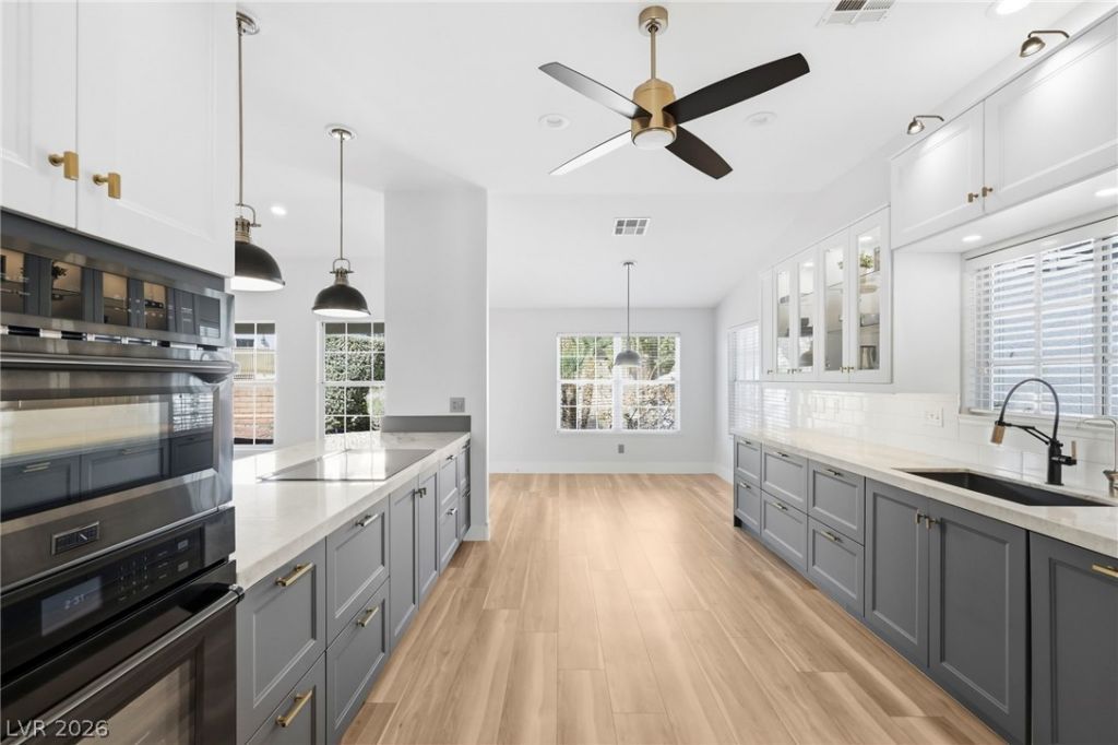 Fully remodeled single-story home with a 3-car garage on a nearly ¼-acre lot and over $65K in modern upgrades! This spacious 2,349 sq ft move-in ready home offers 3 bedrooms plus a den (possible 4th bedroom) and a bright open floorplan with separate living and family rooms featuring a cozy fireplace and vaulted ceilings throughout. Elegant modern chandeliers highlight the entry and dining areas. The stunning custom chef's kitchen features quartzite countertops, a large breakfast bar, recessed lighting, custom cabinetry with interior lighting, and a walk-in pantry. High-end appliances include GE induction cooktop, ZLINE convection oven and microwave, and Samsung refrigerator. Additional upgrades include R/O and hydrogen water systems, large laundry room with cabinets and sink plumbing, new 40-gallon water heater, and new main water valve. Beautifully upgraded and designed for comfortable living and entertaining inside and out. Come walk through this beauty today!!!