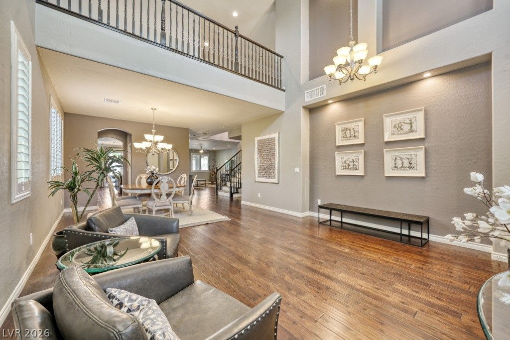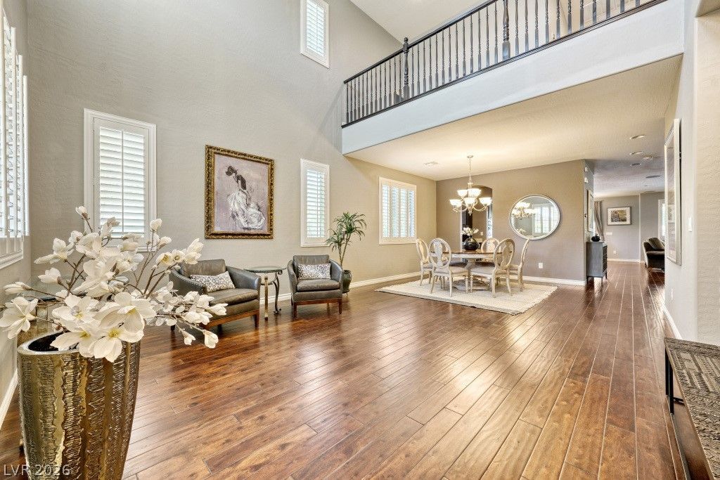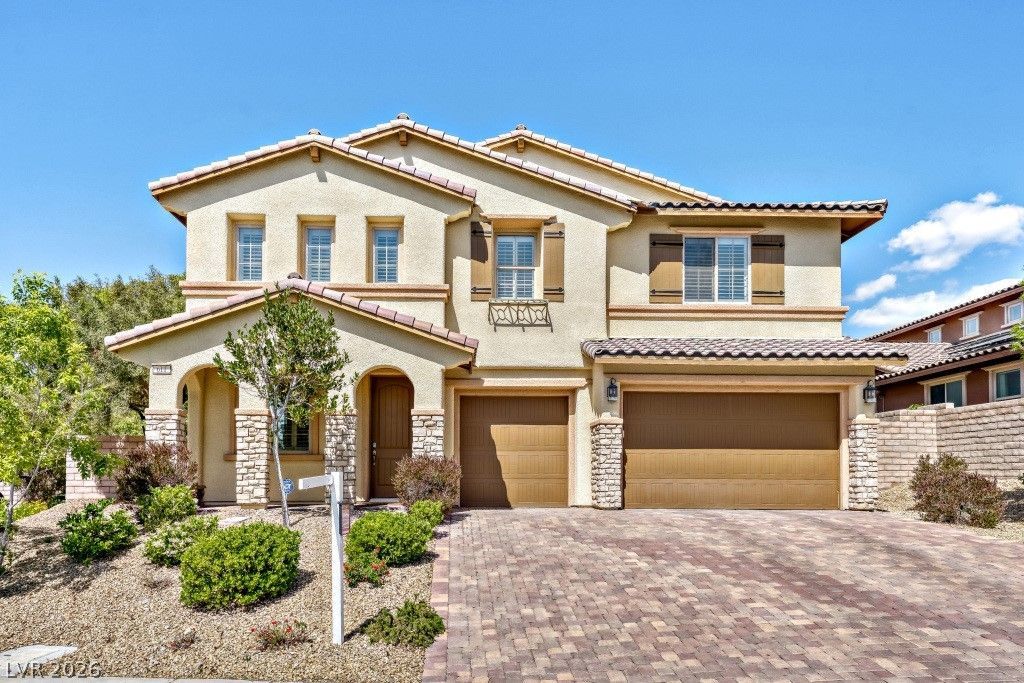Welcome to gated Andalusia in The Paseos one of Summerlin's most desirable communities! This beautifully maintained home offers a thoughtfully designed layout with dual primary suites, including a private downstairs suite with its own bath and laundry perfect for guests or multigenerational living. The main level features rich hardwood flooring, espresso cabinetry, granite countertops, stainless steel appliances, plantation shutters, and three fireplaces that add warmth and character throughout. Upstairs, enjoy a spacious loft and a private primary retreat featuring two closets, a spa-inspired bath, and a balcony with mountain views. Step outside to your own backyard retreat, complete with a pool, spa, outdoor fireplace, covered patio, built-in BBQ with fridge, and mature fruit trees perfect for relaxing or entertaining. A 3-car garage and paver driveway complete this exceptional home, all set within a gated community near parks, trails, and Downtown Summerlin.